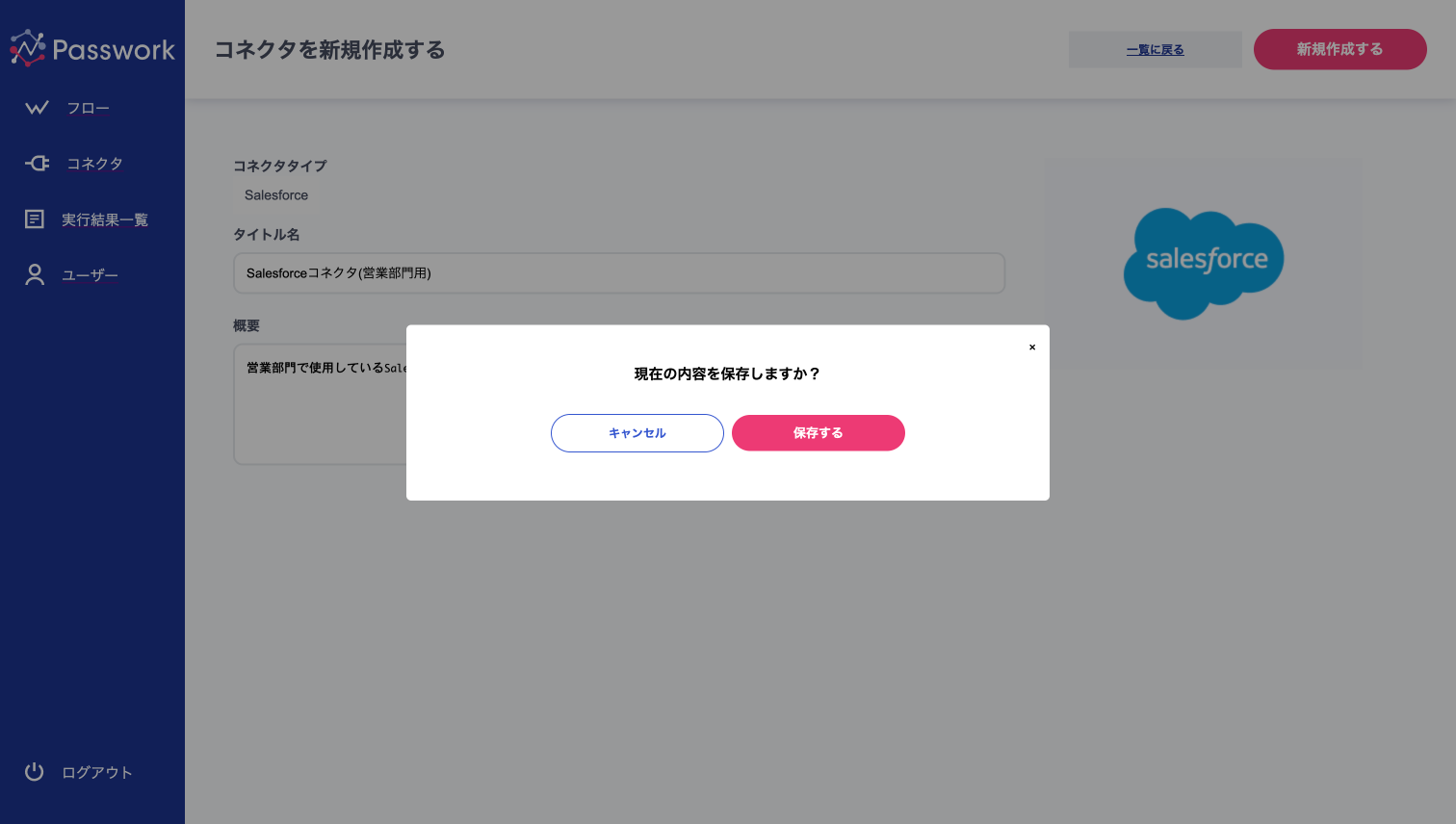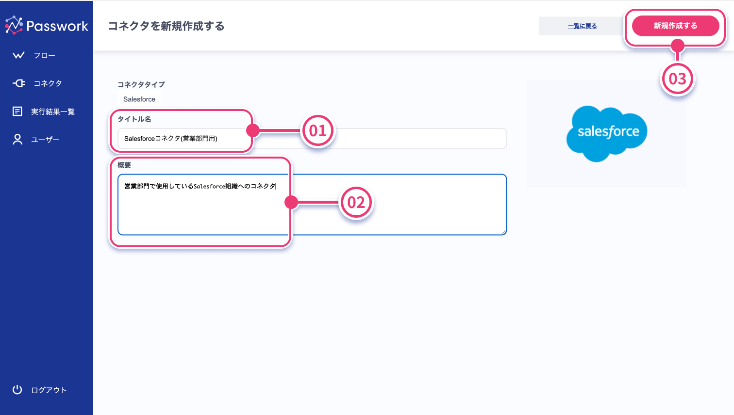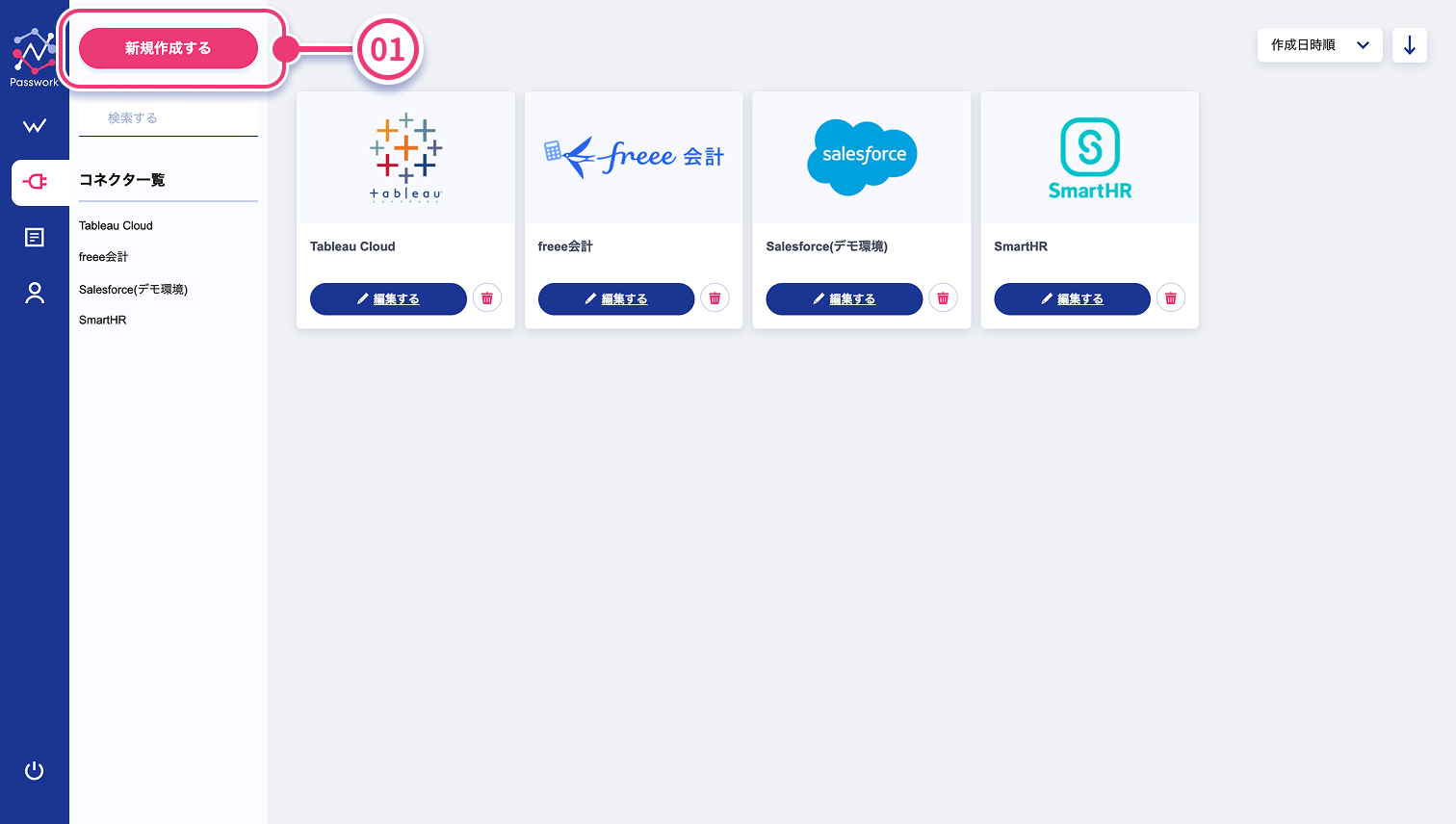 画面右上の「新規作成する」ボタンをクリックして、コネクター作成画面に進みます。