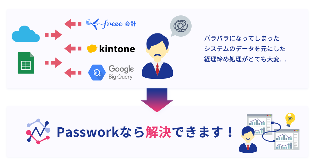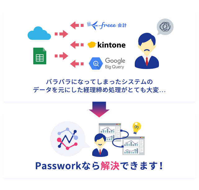 Passworkは各種システム間の連携を自動化し、従来手作業で行っていたデータの抽出・統合・チェックまでの一連のプロセスを完全自動化します。複数システムからのデータ取得、データ形式の標準化、クレンジング処理などを事前設定したフローに従って自動実行するため、担当者の作業時間を大幅に削減し、本来の業務に集中できる環境を構築します。