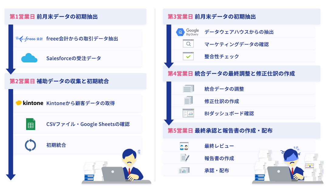 各担当者がそれぞれの作業を順次進める従来の運用では、データ抽出から最終レポート作成まで約5営業日を要していました。この長いリードタイムにより、経営陣が最新の財務状況に基づいた意思決定を行えず、ビジネス環境の変化に対する対応が遅れるリスクが常にありました。迅速な経営判断のためのデータ提供が課題でした。