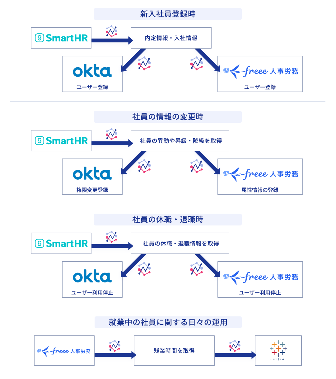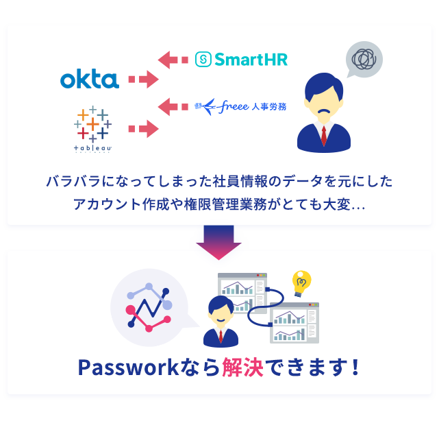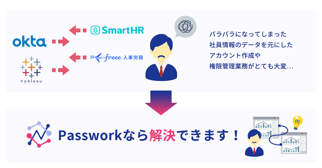 SmartHR、Okta、freee人事労務、Tableauなど複数のシステムに分散している社員情報を、Passworkを活用して自動的に連携します。各システム間でのデータ連携を自動化することで、手作業による入力ミスや更新漏れを防ぎ、常に最新の状態を維持できる環境を実現します。