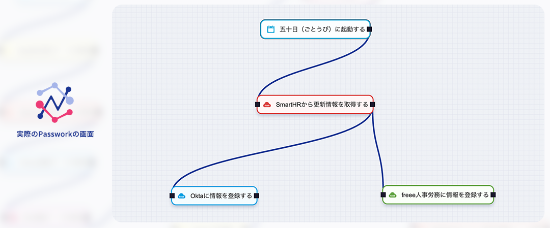 Passworkは専門的なITスキルがなくても操作できる視覚的なインターフェースを提供しています。システム間の連携フローをドラッグ&ドロップの簡単操作で設計でき、複雑なデータ連携も視覚的に把握できます。これにより、人事担当者やIT担当者の負担を軽減しながら、効率的なワークフロー構築が可能です。