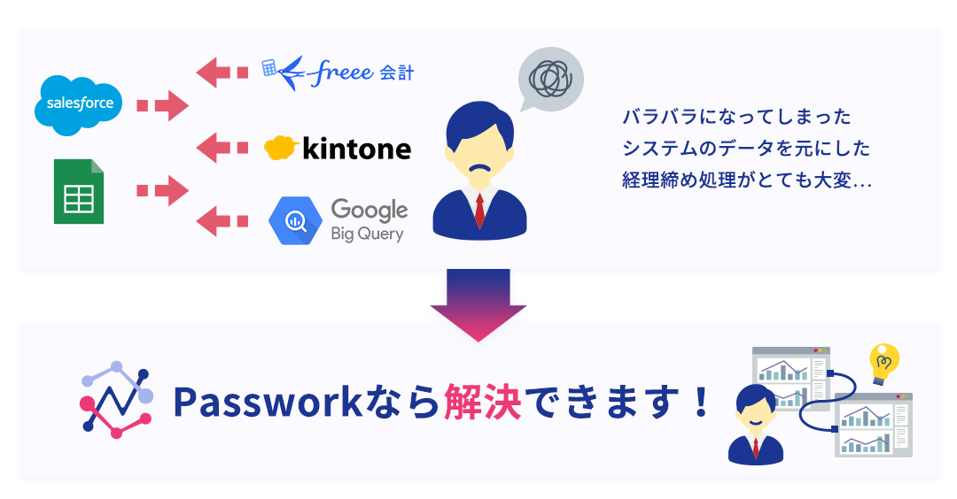 freee会計、Salesforce、Kintoneなど複数システムからのデータ収集・統合に膨大な手作業が発生し、作業効率が大幅に低下していた。