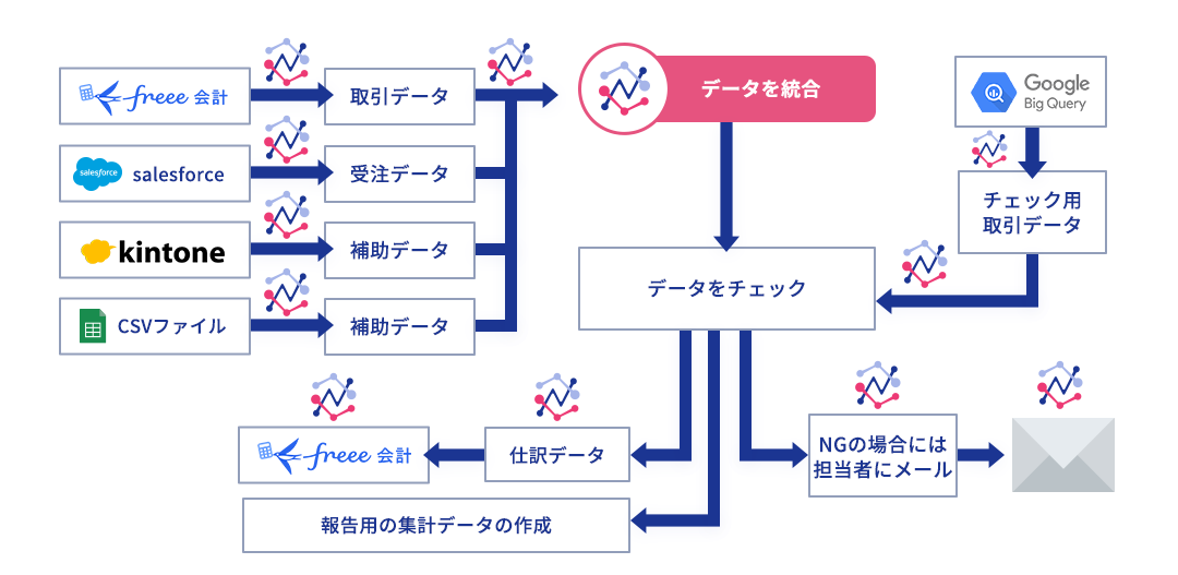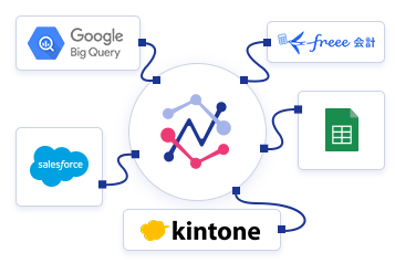 freee会計、Salesforce、Kintoneなど様々なシステムからデータを自動的に収集・統合できます。従来は手作業で行っていたデータのエクスポート・インポート作業を完全に自動化し、各システム間の情報連携をシームレスに実現。人的ミスのリスクを大幅に削減しながら、データの鮮度と正確性を向上させます。