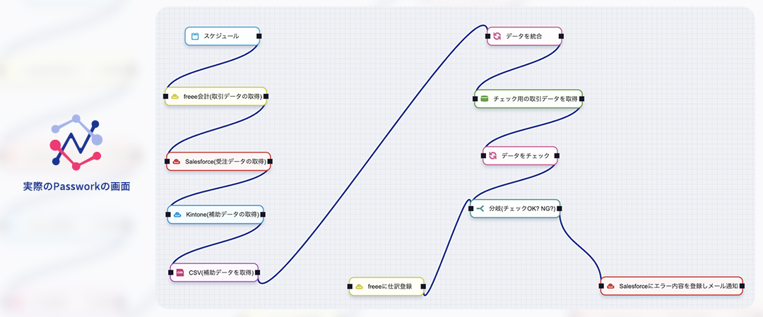 Passworkは各種システム間の連携を自動化し、従来手作業で行っていたデータの抽出・統合・チェックまでの一連のプロセスを完全自動化します。複数システムからのデータ取得、データ形式の標準化、クレンジング処理などを事前設定したフローに従って自動実行するため、担当者の作業時間を大幅に削減し、本来の業務に集中できる環境を構築します。