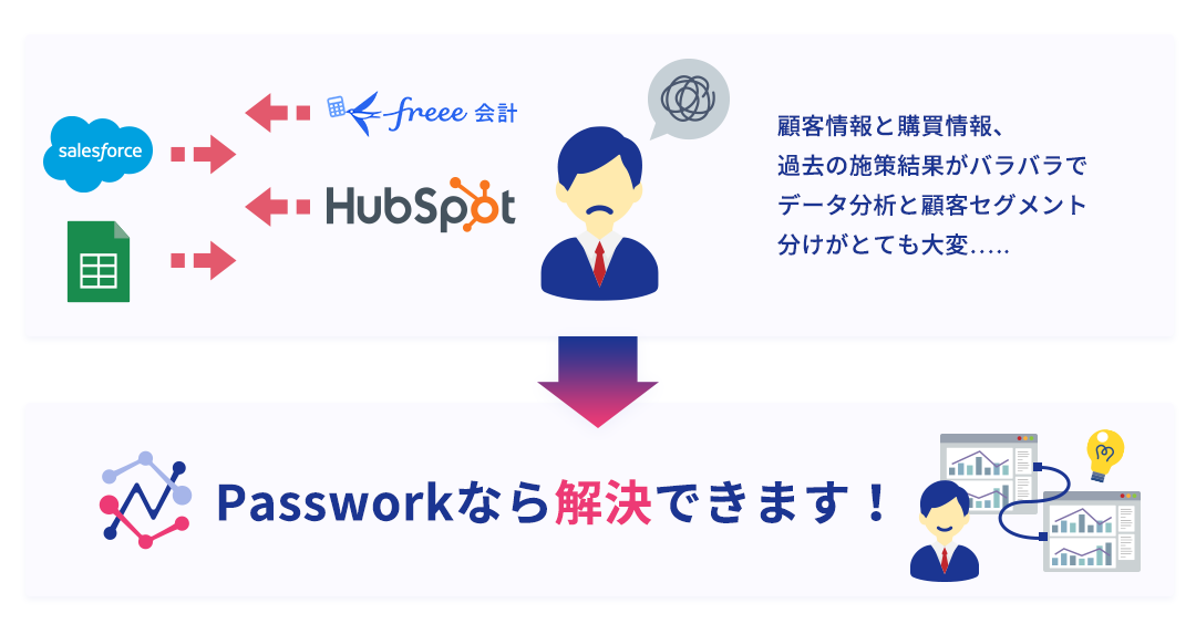 • Salesforce、freee会計、HubSpotなど複数のシステムからデータ抽出・統合に多くの工数がかかり、マーケティング施策の立案に十分なリソースを割けない