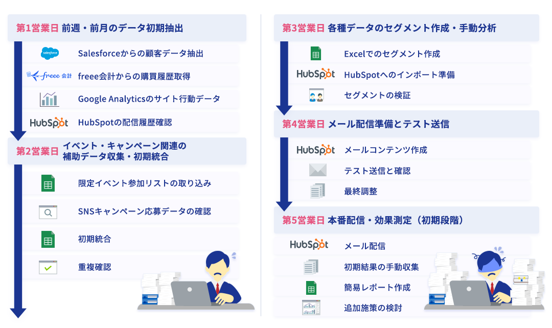 複数システムからのデータ抽出、統合、加工など、多くの手作業が必要でした。Salesforceから顧客データを抽出し、HubSpotのメール配信履歴を確認、さらにイベント参加リストやSNSキャンペーン応募者データを手動でExcelに取り込むなど、データ準備だけで膨大な工数を要していました。これらの手作業は担当者の負担となるだけでなく、ミスが発生するリスクも高くなっていました。