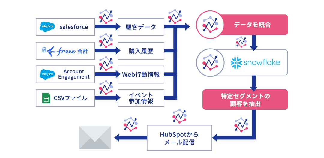 顧客情報や購買履歴など、Salesforce、freee会計、HubSpotといった異なるシステムに分散している顧客データを自動的に統合。バラバラだった顧客情報と施策結果を一元的に把握できるようになり、過去の施策効果を踏まえた精度の高いセグメント作成が可能になります。これにより、顧客一人ひとりに最適なマーケティングアプローチが実現できます。