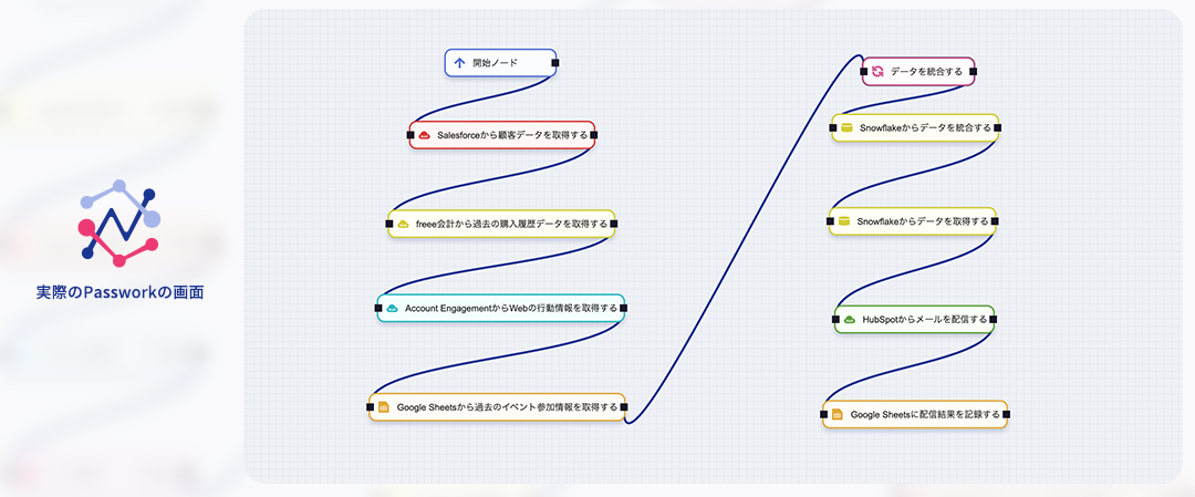 Passworkは、Salesforce、freee会計、Account Engagement、CSVファイルなど複数システムからのデータ取得・統合を完全自動化します。直感的なドラッグ&ドロップのインターフェースでデータフローを視覚的に設計でき、専門知識がなくても簡単に設定可能。データはSnowflakeに自動格納され、常に最新の統合データにアクセスできるため、手作業による転記ミスやデータの鮮度低下の問題が解消されます。
